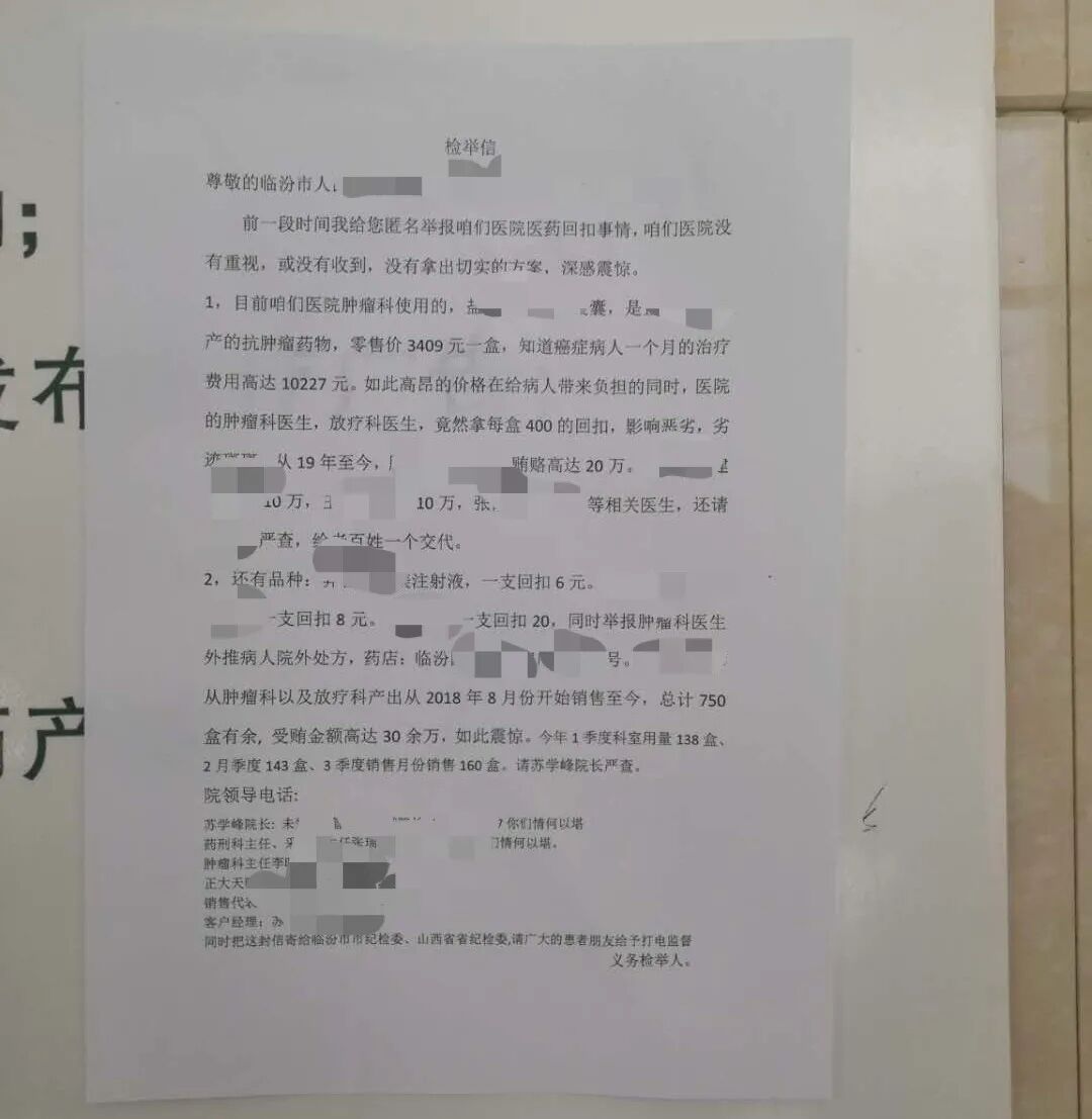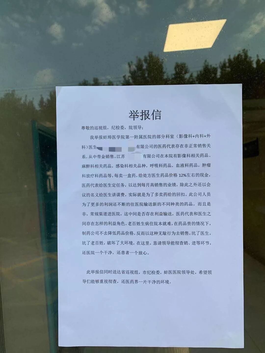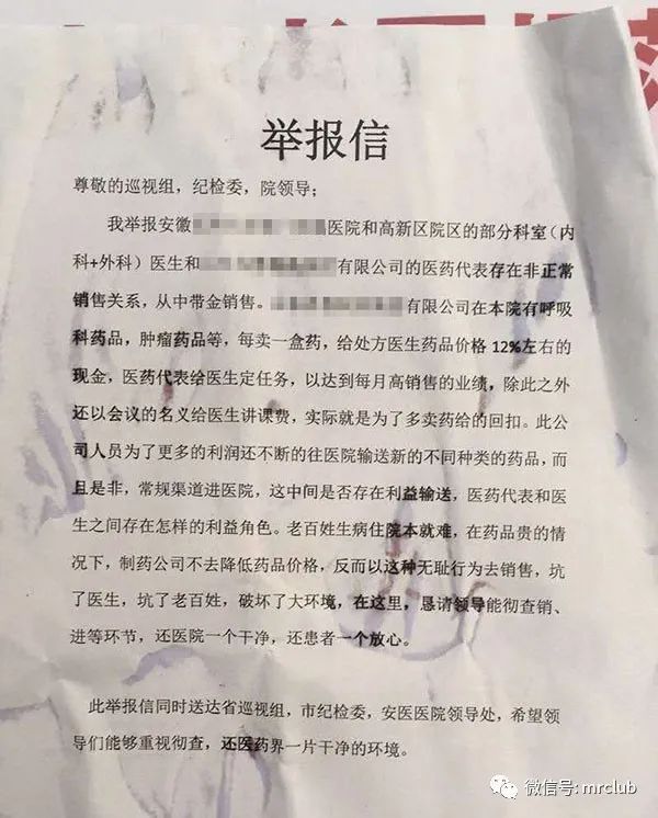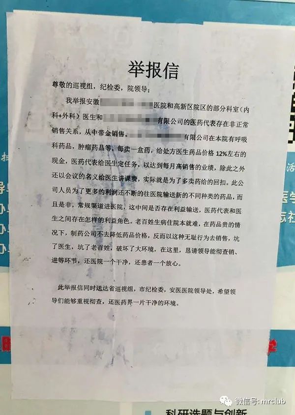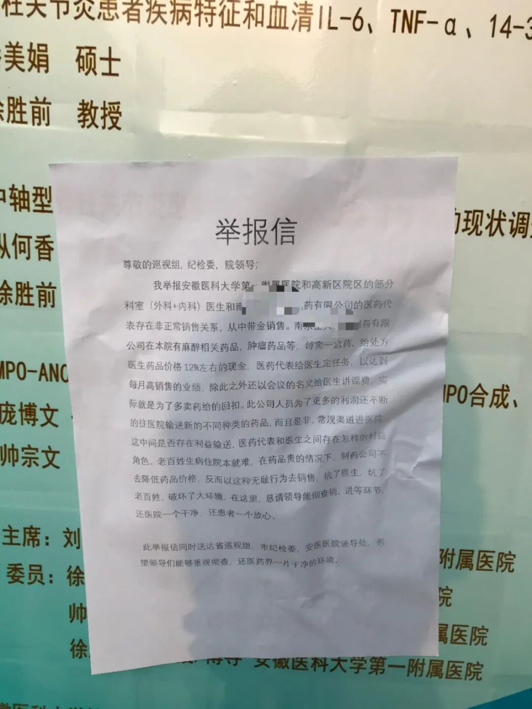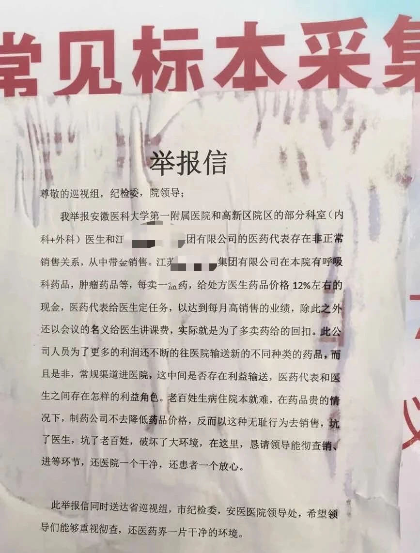 近日,安徽多家三甲医院贴出了多封匿名举报信。这些举报信的内容大致相同。举报信直指,这些医院部分科室医生和医药代表存在不正常销售关系,存在带金销售问题。举报涉及品种是来自3家国内知名药企的产品,包括麻醉药、肿瘤药等,给医生的回扣金额占到药价的12%左右,还以会议的名义给医生支付讲课费。有的举报信指明了涉及的药品,有的举报信给出了回扣的金额或比例。有的指明医生和医药代表存在不正常销售关系,存在带金销售问题。“……产的抗肿瘤药物,零售价3409元一盒,癌症病人一个月治疗费用10227元,医院的肿瘤科医生,放疗科医生竟然拿每盒400回扣……”