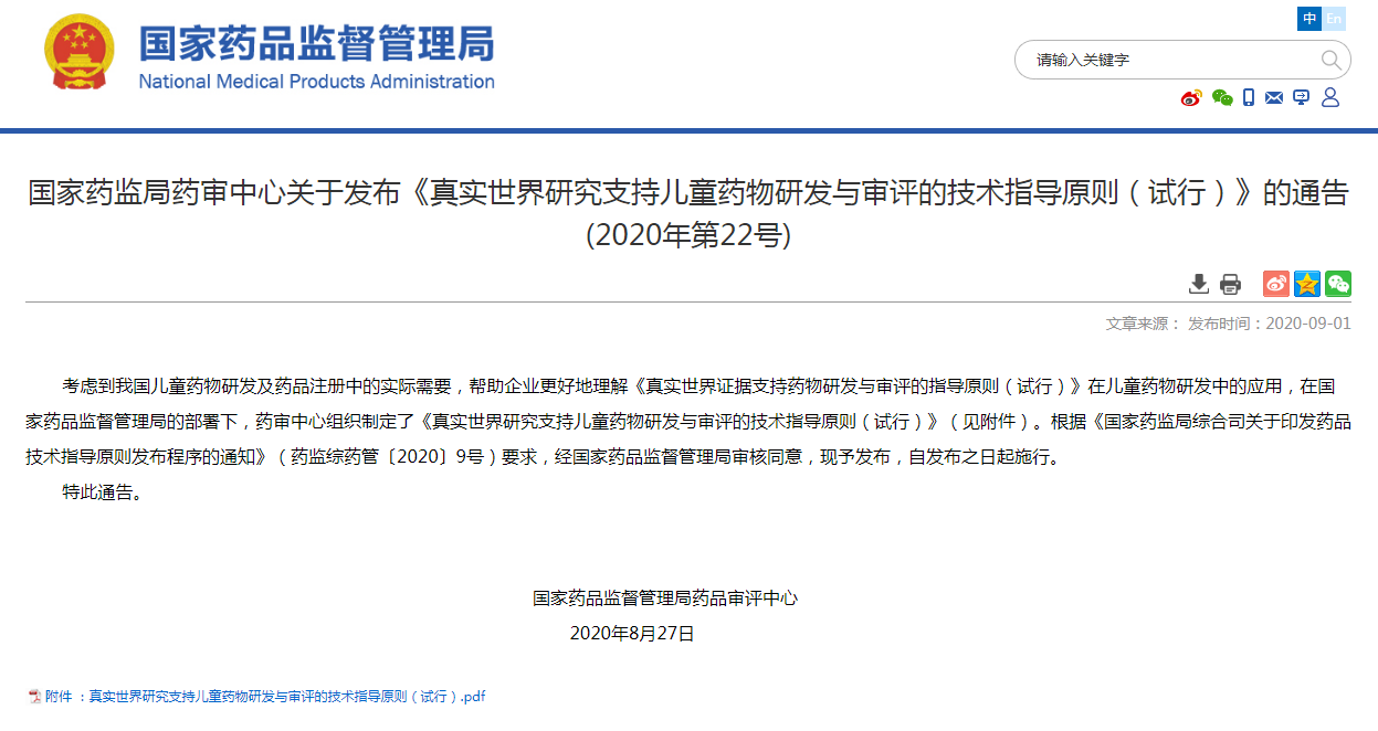 9月1日,国家药监局药审中心发布2020年第22号文——关于发布《真实世界研究支持儿童药物研发与审评的技术指导原则(试行)》(以下简称“指导原则”)通告。儿童药物发需要通过适当的研究数据支持药物在目标年龄段儿童患者中的合理使用。然而,在实际操作中,按照传统临床试验的设计和研究方法,以儿童为受试者的试验与成人试验相比,面临更多困难与挑战。儿童临床试验常常难以开展或进展缓慢,导致药物在儿童中使用的有效性和安全性评价证据不足,从而影响儿科临床中药品的可及性和使用规范性。真实世界研究(Real-World Research/Study,RWR/RWS)作为新研究方法中的一种,已逐步用于支持儿童药物的研发与审评,为新药注册、扩展儿童适应症、完善儿童剂量方案等提供支持。国家药品监督管理局于2020年1月7日发布了《真实世界证据支持药物研发与审评的指导原则(试行)》,文中明确指出,利用真实世界证据是儿童药物研发的一种策略。5月19日,药品审评中心(CDE)起草并发布《真实世界证据支持儿童药物研发与审评的技术指导原则》“征求意见稿”,再次引发行业对于真实世界证据支持儿童药物研发的适用范围的关注。本次发布的《指导原则》回应了行业的关切,介绍了现阶段真实世界研究支持我国儿童药物研发时的常见情形及关注点,并给出了案例及说明。