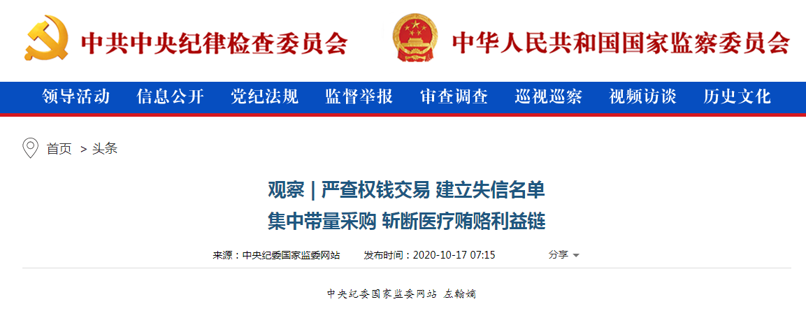 10月17日,中纪委网站发布《严查权钱交易,建立失信名单,集中带量采购,斩断医疗贿赂利益链》一文,内容直指医药代表与医疗机构的不正当交易。近日,中央纪委国家监委网站一则视频曝光了浙江省杭州市桐庐县第一人民医院原药剂科工作人员王晓俊利用职务便利,伙同他人在新药引进、药品采购等方面为药商谋取利益,非法收受回扣1019万余元的受贿案件细节。这其中,仅注射用拉氧头孢钠等2种药品就为王晓俊等人带来了高达325万元的“好处费”。多名药商表示,王晓俊收取的回扣高达药品零售价的40%。除涉案金额巨大、腐败行为日益隐蔽外,近年来查处的医药贿赂案件还呈现出多人参与的特点。中国裁判文书网近期公布的一则判决书显示,江苏省苏州大学附属第二医院心血管内科原主任陈建昌利用职务之便,为多家公司代理的医用耗材销售、使用给予支持和帮助,共计收受上述公司实际负责人樊某所送人民币322万元。此外,樊某还通过陈建昌向该科室其他人员行贿,金额共计279万元。收受药品及医用耗材回扣,是医药贿赂的常见表现形式。有些是显性的,比如现金转账;还有些是隐性的,比如给予礼品礼金、资助旅游等。受贿和行贿是医药腐败的两个方面,但在查处医疗腐败案件时,往往是受贿者接受了法律的制裁,行贿者付出的代价却几乎可以忽略不计。与行贿带来的巨大利益相比,其低廉的“成本”让不少药企在东窗事发后依旧我行我素,反复行贿、同时向多人行贿的现象时有发生。针对行贿方,国家医保局日前印发《关于建立医药价格和招采信用评价制度的指导意见》,要求各地于2020年底前建立并实施信用评价制度,涉及医药商业贿赂等7种失信行为的医药企业将被纳入失信“黑名单”。药企一旦出现失信行为,将面临书面提醒告诫、依托集中采购平台向采购方提示风险信息、限制或中止相关药品或医用耗材挂网、限制或中止采购相关药品或医用耗材、披露失信信息等处置措施,失信行为涉及省份数量达到规定条件的,还将由国家医保局医药价格和招标采购指导中心启动全国联合处置。由此,药品、器械耗材回扣、利益输出等行业内普遍的潜规则,现在成为集采、挂网采购的障碍,给予回扣会导致其丧失进入集中采购市场的机会。药企、药代躺着挣钱的日子结束了。除建立药企信用评价制度外,近期医疗领域还有一系列“大动作”。国家药品集采为例已走向常态化运行,药品集采已开展三批,共涉及112个品种,平均降幅54%,药价虚高水分被大幅挤出。9月14日,国家组织高值医用耗材集中采购和使用工作启动会于天津召开,标志着继药品集中采购后,以冠脉支架为代表的高值医用耗材也将全面进入带量采购时代。国家医保局副局长陈金甫表示:“必须斩断原有销售模式对中国行业发展的影响,真正通过成本的比拼、质量的竞争、创新的引领,来催生规模发展、优势发展。”9月下旬,国家卫生健康委会同相关部门组织开展医疗卫生行业综合监管督察,对北京、河北等19个省(区、市)和新疆生产建设兵团进行实地督察。督察组主要征集医药领域商业贿赂等5方面问题线索,对其中有代表性的问题线索,在实地督察时进行抽查核查,及时回应社会关切。9月30日,国家药监局组织制定的《医药代表备案管理办法(试行)》对外公布。其中明确提出,医药代表不得承担药品销售任务,实施收款和处理购销票据等销售行为。另外,文件对医药代表主要工作任务进行了明确,包括四方面:拟订医药产品推广计划和方案;向医务人员传递医药产品相关信息;协助医务人员合理使用本企业医药产品;收集、反馈药品临床使用情况及医院需求信息。为彻底斩断药品耗材回扣利益链,在国家打出一系列遏制药价虚高的组合拳。灰色的利益链条能否彻底斩断?目前行业看来有几点变化: