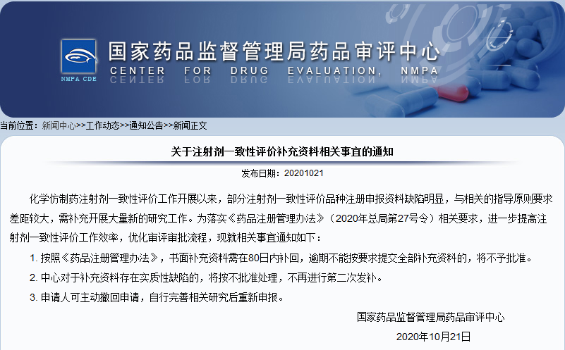 《通知》称,为落实《药品注册管理办法》(2020年总局第27号令)相关要求,进一步提高注射剂一致性评价工作效率,优化审评审批流程,提出:1、按照《药品注册管理办法》,书面补充资料需在80日内补回,逾期不能按要求提交全部补充资料的,将不予批准。2、CDE对于补充资料存在实质性缺陷的,将按不批准处理,不再进行第二次发补。3、申请人可主动撤回申请,自行完善相关研究后重新申报。今年5月14日,国家药监局发布《国家药监局关于开展化学药品注射剂仿制药质量和疗效一致性评价工作的公告》,要求已上市的化学药品注射剂仿制药,未按照与原研药品质量和疗效一致原则审批的品种均需开展一致性评价。根据相关要求,依据《关于仿制药质量和疗效一致性评价工作有关事项的公告》(2017年第100号),审评工作应当在受理后120日内完成。经审评认为需申请人补充资料的,申请人应在4个月内一次性完成补充资料。发补时限不计入审评时限。注射剂一致性评价一直是行业的热门话题,此前国家也陆续出台了相关文件。