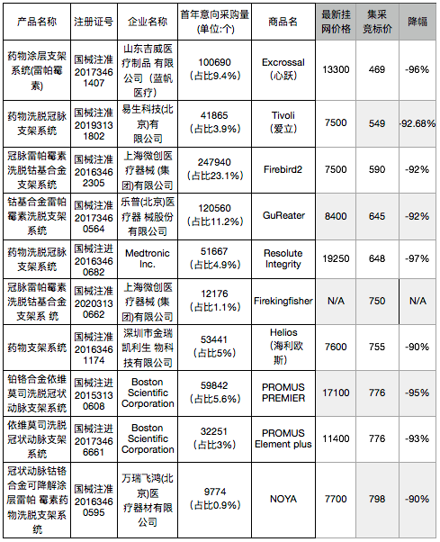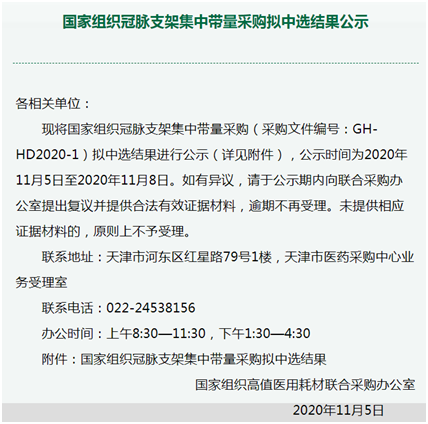 国采结果公示:心脏支架从1.3万掉至700,“万元时代”进入“百元时代”11月5日,备受瞩目的首次国家组织高值医用耗材集中带量采购在天津开标。天津市医药采购中心发布“国家组织冠脉支架集中带量采购拟中选结果公示”,本次集中带量采购的冠脉支架材质为钴铬合金或铂铬合金,载药种类为雷帕霉素及其衍生物,采购周期为两年,预计全国患者将于2021年1月用上国家集采降价后的中选产品。拟中选结果公示时间为2020年11月5日至2020年11月8日。其中8家企业的10个产品拟中标。
