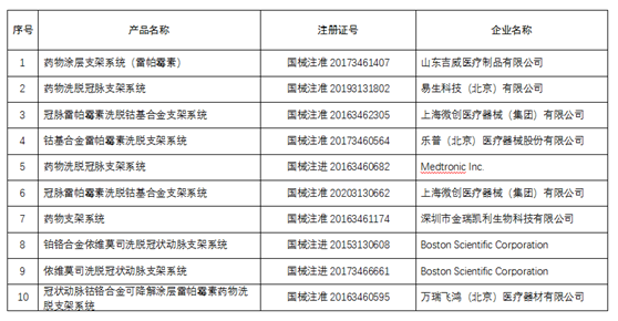 据国家医疗保障局提供的数据及国家组织高值医用耗材联合采购办公室公示的拟中标信息,本轮冠脉支架国家集采,共有11家企业参与投标,我国境内注册上市的26个冠脉支架产品参加。通过竞争,产生拟中选产品10个,这些产品来自吉威医疗、易生科技(北京)有限公司、上海微创医疗器械(集团)有限公司、乐普(北京)医疗器械股份有限公司、深圳市金瑞凯利生物科技有限公司和万瑞飞鸿(北京)医疗器材有限公司共6家国产厂商,以及2家外资企业美敦力、波士顿科学。