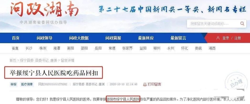 10月13日,一篇题为《举报绥宁县人民医院吃药品回扣》的贴文,在网上广泛传播。举报者称,自己是绥宁县人民医院的医师,之所以举报医院吃回扣,是为了净化行医环境。帖子显示,医院院长XXX失职,涉嫌商业贿赂,同时大药商承包了医院药房,医院98%的药品属于两位大老板。