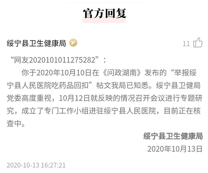 针对上述帖子,绥宁县卫生健康局于10月13日作出回应:绥宁县卫健局党委高度重视,10月12日就反映的情况召开会议进行专题研究,成立了专门工作小组进驻绥宁县人民医院,目前正在核查中。