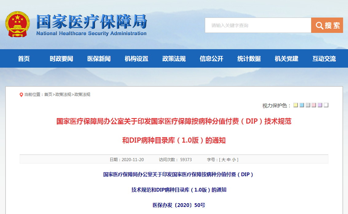 11月20日,国家医保局发布《关于印发国家医疗保障按病种分值付费(DIP)技术规范和DIP病种目录库(1.0版)的通知》(医保办发〔2020〕50号,以下简称《通知》),同时公布了《国家医疗保障按病种分值付费(DIP)技术规范》、《DIP病种目录库(1.0版)》。这是继11月3日公布71个试点城市之后,国家医保局推动DIP按病种分值付费工作的又一实质性举措。根据国家医保局在2020年10月19日发布的《关于印发区域点数法总额预算和按病种分值付费试点工作方案的通知》,2020年底将进入DIP付费阶段:2020年12月,各试点城市使用实时数据和本地化的分组方案实行预分组,做好付费技术准备工作;自2021年3月起,根据试点地区技术准备和配套政策制订情况,具备条件的地区备案后可以先行启动实际付费;2021年年底前,全部试点地区进入实际付费阶段。《国家医疗保障按病种分值付费(DIP)技术规范》与《DIP病种目录库(1.0版)》的发布,无疑推动DIP朝付费阶段更进一步,各试点城市将以此为基础,做好付费技术准备工作。DIP又称病种分值法,是一种基于大数据的DRG付费方式,而按病种分值,是指医疗系统按照“疾病分组+治疗方式”的方式,将患者的电子病历组合成病种,以各病种的均次住院费用形成病种间的价格分值,再考虑年龄、并发症和伴随病因素对病种付费进行校正,从而实现精细化、个性化支付。其含义是指不再明确医疗机构的总额控制指标,而是将病种、项目等医疗服务的价值以点数进行量化。根据医疗机构提供服务的总点数以及地方医保基金支出预算得出每个点的实际价值,按照各医疗机构点数付费。《病种库》将主目录区分为核心病种近11553组,综合病种2499组,各试点城市的病种目录库的分组规则与《病种库》保持一致。国家医保局统一组织使用试点城市报送的历史数据形成各试点城市的病种目录库。各试点城市在试点过程中按照统一的分组规则不断完善本地的病种目录库。