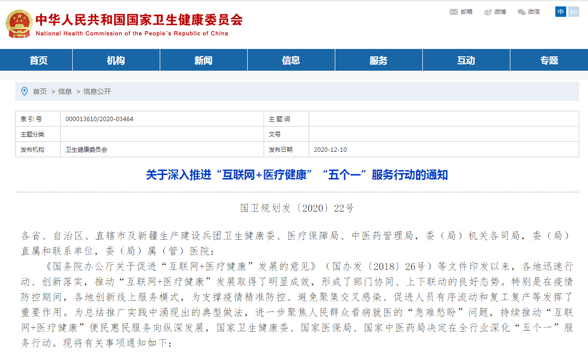 近日,国家卫健委、国家医保局、国家中医药管理局联合发布《关于深入推进“互联网+医疗健康”“五个一”服务行动的通知》。通知要求,推进“一体化”共享服务,提升便捷化智能化人性化服务水平;推进“一码通”融合服务,破除多码并存互不通用信息壁垒;推进“一站式”结算服务,完善“互联网+”医疗在线支付工作。