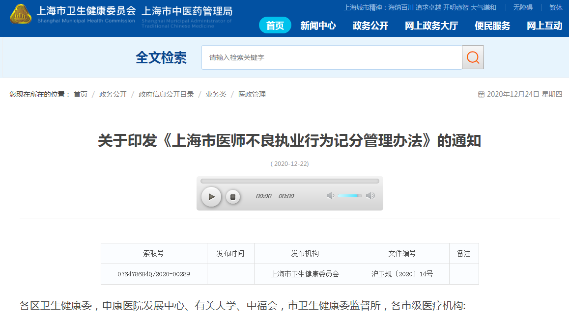 12月22日,上海市卫健委正式发布《上海市医师不良执业行为记分管理办法》的通知,上述办法自2021年2月15日起施行,有效期至2026年2月14日。