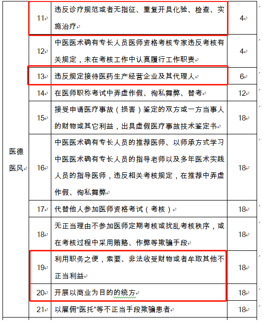《四川省医务人员不良执业行为记分管理办法(2020年版)》则把不良执业行为分为50分、30分、20分、10分、5分、2分、1分七个档次,累积记分100分以上的医务人员3年内不得从事任何医疗卫生技术服务工作。