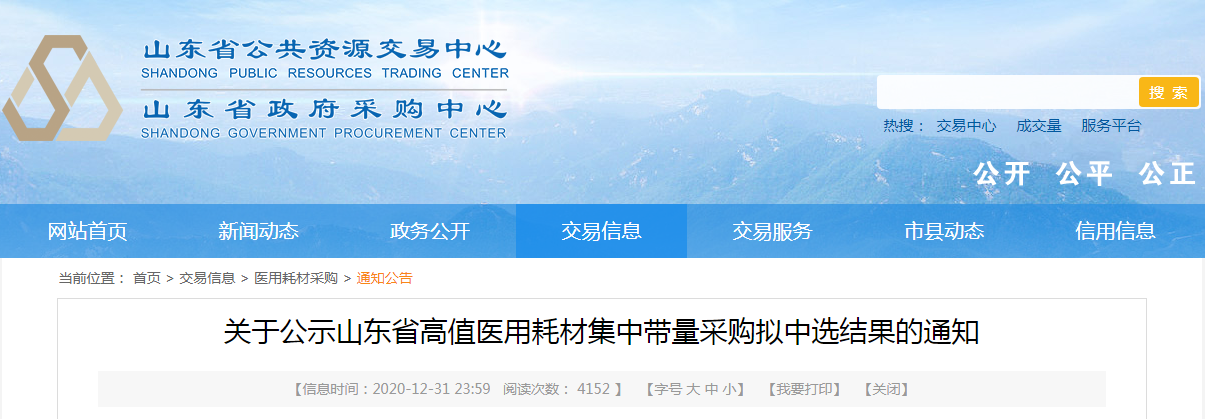 去年底,山东省政府采购中心最新发布了一则《关于公示山东省高值医用耗材集中带量采购拟中选结果的通知》(以下简称《通知》)。《通知》显示,此前山东省对冠脉介入类快速交换扩张球囊、初次置换人工髋关节、可吸收硬脑(脊)膜补片、一次性使用套管穿刺器、心脏起搏器(双腔)5大类高值耗材开展带量采购已经结束,现将中标结果进行公示。