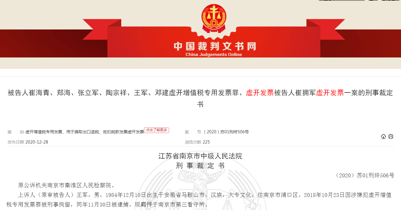 原审判决认定,2017年11月至2018年9月间,在被告人张立军、陶宗祥、王军、邓建居间介绍下,通过被告人崔海青、郑海负责经营的海青药业公司、鸿泰公司,向宗某担任代理商的南京优科制药有限公司(以下简称优科公司)虚开增值税专用发票239份,价税合计人民币(以下币种相同)17924590元,税额1014599元;通过被告人崔海青、郑海负责经营、被告人崔拥军担任法定代表人的海青贸易公司,向宗某担任代理商的优科公司虚开增值税普通发票78份,价税合计6385080元。