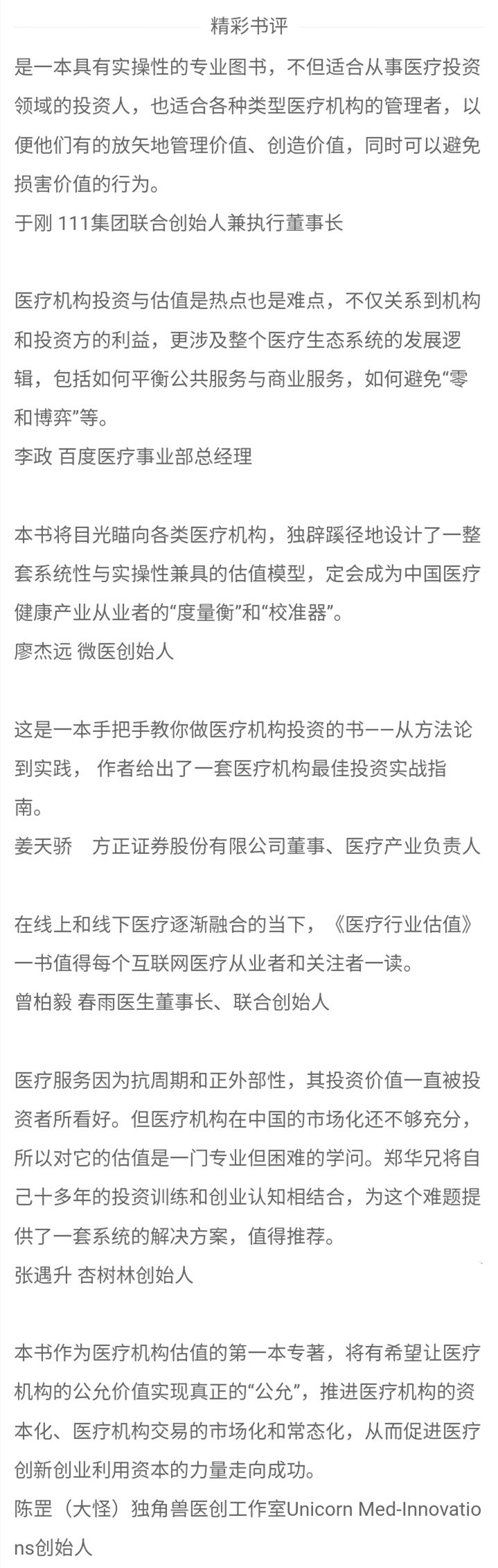随着创业进入第六年,正是我们互联网医疗行业的谷底,当然现在看得很清楚大多数VC投资人总是从一个极端走向另一个极端,跟风起哄得多,跟一个个大散户差不多,水平高的凤毛麟角!而郑华说最近很多上市公司在投资医院,他想做一些研究,由于公开资料过少,我们只好选择了爱尔眼科,他主要分析财务,我从医疗这块入手,各种假设与未来预期进行推算,其实这就是《医疗行业估值》的前身,也是最重要的案例。我们这块也诸多争论,有时候一个电话讨论一小时,印象中关于院士如果开医院怎么估值,就争论了好几天。为了写长期护理机构的内容,我托MBA的同学老胡联系了苏州最好的照护机构,和郑华一起去参观学习。关于门诊部分,一起去向我曾经的医院老领导拜访,深入了解上海最豪华的门诊如何运营等等。由于郑华的英文水平比中文水平高得多,所以我参与了全书文字统筹与修订,其间断断续续了一年半。如果逐字逐句审校一下,一般要从晚上七八点干到第二天早上五点,我和郑华分别弄了一两回,本以为可以了,最后出版社说,字数太多书会太贵,我们被迫缩减了接近一半的文字,最后一起在他家里熬了个通宵。用郑华的话说,自己写的书根本不想看,一看就要吐,我觉得他说的对!感谢中国CVA估值协会的刘老师推荐与作序,以及多位圈内好友的助阵,比如非常帅气却更为有才的姜天骄兄弟,好大夫在线的王航兄,壹药网的于刚老师,微医的廖杰远董事长,春雨医生的曾柏毅总,杏树林的张遇升总以及李政老师大怪兄弟等,都在百忙之中写了书评!我十分想念过世的张锐大哥,在你的咖啡厅里从中午聊到晚上,连蹭两顿饭带下午茶,一晃都五年了,真是时光飞逝啊,要是你还在,那必须给我弄个序写个评啥的!单就这本书,非常谦虚地说,还真的是一本集大成的教材!哪怕每一个小知识点都参考了很多的著作与国家政策,做了很多考证,即使三年后我们看当初写的文字,仍然没有过时或者结论错误,可以说最开始我们真的没有想写书啊,就是想买一本现成的而已,但是,关于医疗行业估值特别是医疗机构的估值,一本都没有!郑华和我分别找遍了整个市场都一无所获,没办法,那就只好自己写一本吧,并不是开玩笑,这就是我们的日常对话!本书由于字数限制删减了很多理论上的东西,所以部分地方有一些跳跃,有些地方被迫重复了一下。关于本书的导读,身为一个贡献最少的作者,我其实建议,如果你时间少,优先完整阅读与学习爱尔眼科这个案例,然后再略读一下平安好医生的案例,特别对于模型的构建,假设与压力测试等仔细思考一下,然后带着一些问题再读前面的一些基本概念与理论,特别是医疗行业的特点,跟实体店,快消,电商与互联网行业都不相同,很多时候无法类比,因为这是一个充满行政管制与技术壁垒,又要兼顾社会民生的行业,并非完全是充分竞争的!而且突发的黑天鹅会特别多,并且政策也会经常反复,前后矛盾,比如医药电商卖处方药的政策!我本来想把“高山战略”的市场推论写进去,这样关于市场先入与后入的优劣比较会更完整。不过没关系,《医疗行业估值》系列第二本里肯定会有的,因为我们上部只涉及了医疗机构与互联网医疗,而关于创新药,普药,医疗器械,IVD与CRO的案例会在下部书里详述,谁让我们就喜欢班门弄斧呢?