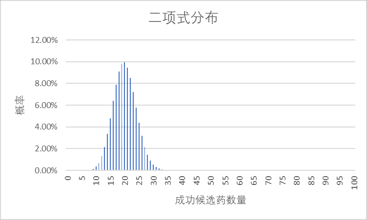 我们可以发现,完全失败的风险概率几乎为0 ((1-20%)^100)。15款到25款候选药的成功率为83.21%。此外,我们也可以看到,超过35款药上市的可能性几乎为0。