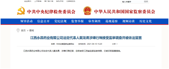 4月10日下午,中央纪委国家监委网站发布通报,江西永昌药业有限公司法定代表人戴龙勇,涉嫌行贿犯罪,目前接受江西省监委监察调查,已被采取留置措施。这是中央纪委国家监委官网要闻频道今年春节以来发布的首个涉及地方药企负责人被调查的消息,并且原因还是之前行业比较少见的“涉嫌行贿犯罪”。