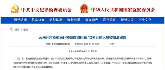 近年来国家高度关注医疗领域腐败现象。此前,中纪委就多次就医药腐败问题进行通报,对行贿行为“零容忍”立场鲜明。4月4日,中央纪委国家监委网站就通报了《云南严肃查处医疗领域腐败问题 12名行贿人员被依法留置》。云南省纪委监委公开通报,四川科茂建筑工程有限公司云南分公司法定代表人诸治有、云南皇凯投资有限公司董事长王华标等4人,涉嫌向昆明医科大学原党委书记袁斌行贿,经多次谈话,仍拒不交代与袁斌之间的不正当经济往来,已被留置。中央纪委国家监委网站5月7日消息,日前,云南省先后查处昆明医科大学原党委书记袁斌、云南省阜外心血管病医院原副院长马林昆、文山州人民医院原院长卢京等一批严重违纪违法案件,并对12名涉嫌行贿人员依法采取留置措施。无论地方纪委监委还是中央纪委监委的通报释放了一个什么信号?涉嫌行贿人被留置,受贿行贿一起查。行贿是腐败行为的重要诱因,是腐败蔓延的重要推手。而且涉嫌行贿人数多、数额大、时间跨度长,行贿多来自私企老板。但是国家监察体制改革前,私企不是监察对象,纪检监察机关没法对他们立案查处。私营企业行贿人员不免这样想,我不是党政领导机关,我也不是行使公权力的公职人员,不是纪委监委的监督范围监督对象,即使我有行贿行为,这些监察机关又能奈我何?但时代变了。2018年3月,《中华人民共和国监察法》颁布施行。第二十二条规定:被调查人涉嫌贪污贿赂、失职渎职等严重职务违法或者职务犯罪,监察机关已经掌握其部分违法犯罪事实及证据,仍有重要问题需要进一步调查,并有下列情形之一的,经监察机关依法审批,可以将其留置在特定场所:对涉嫌行贿犯罪或者共同职务犯罪的涉案人员,监察机关可以依照前款规定采取留置措施。