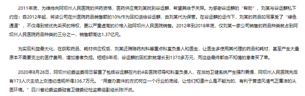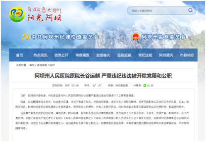 中纪委公布的文章中称“坚持受贿行贿一起查,让侵害医院和患者利益的“围猎者”付出惨痛代价。谷运麒案查处后,阿坝州人民医院积极开展以案促改,将相关违规供应商列入“黑名单”。以阿坝州人民医院为起点,四川全省的医疗卫生问题有了初步改善。
