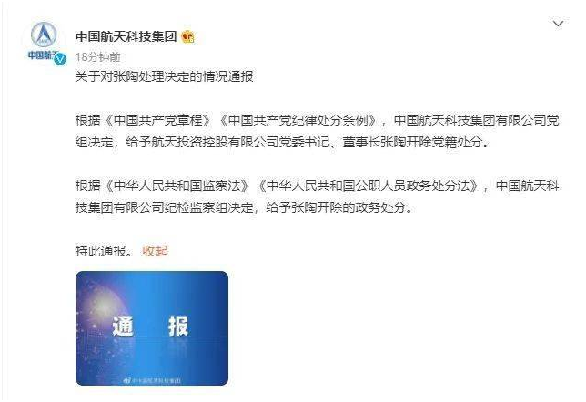 7月19日晚,@中国航天科技集团 发布对张陶处理决定的情况通报: