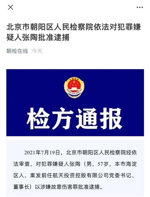 另据朝检在线,2021年7月19日,北京市朝阳区人民检察院经依法审查,对犯罪嫌疑人张陶(男,57岁,本市海淀区人,案发前任航天投资控股有限公司党委书记、董事长)以涉嫌故意伤害罪批准逮捕。