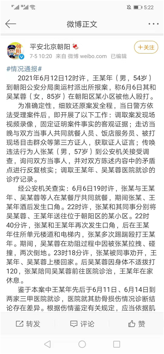 7月5日晚,据北京朝阳警方通报,2021年6月12日12时许,王某年(男,54岁)到朝阳公安分局奥运村派出所报案,称6月6日其和吴某蓉(女,85岁)在朝阳区某小区被他人殴打。
