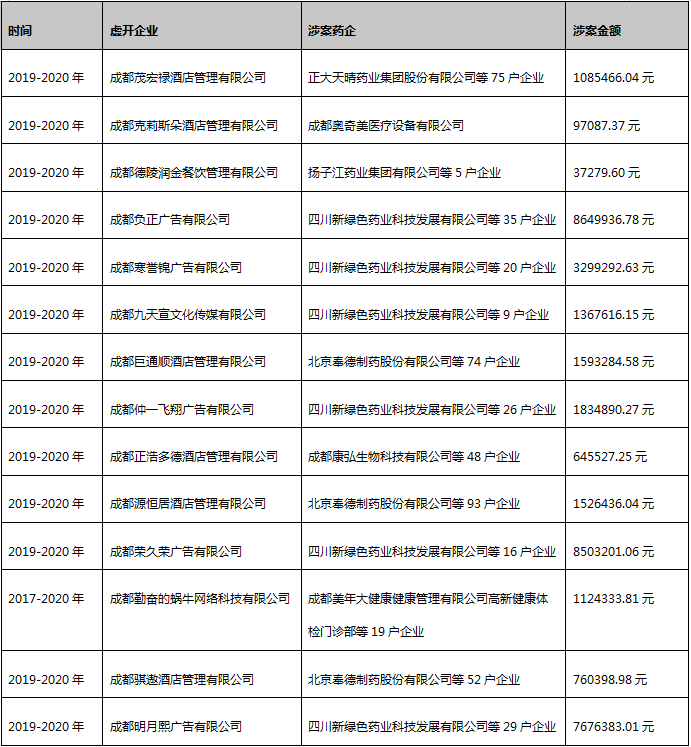 这些收到《税务处理决定书》的企业中, 有14家的虚开发票流向了医药企业,占到总案件数的四分之一,其中不乏 扬子江、正大天晴、美年健康、成都康弘、四川新绿药等知名药企涉案。