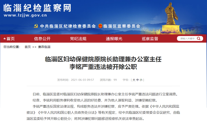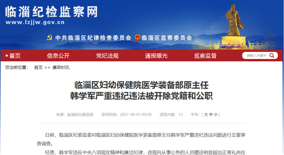 今年3月17日和28日临淄纪检监察网公布了对临淄区妇幼保健院原院长助理兼办公室主任李铭、医学装备部原主任韩学军监察调查的通告,并于6月3日发布了李铭、韩学军严重违纪违法被开除公职、党籍。