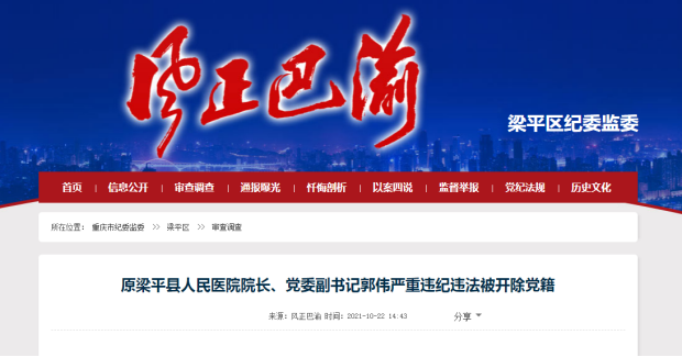 近期,重庆市纪委监委官方网站“风正巴渝”公布了《重庆市原梁平县人民医院院长、党委副书记郭伟严重违纪违法被开除党籍》的通告。