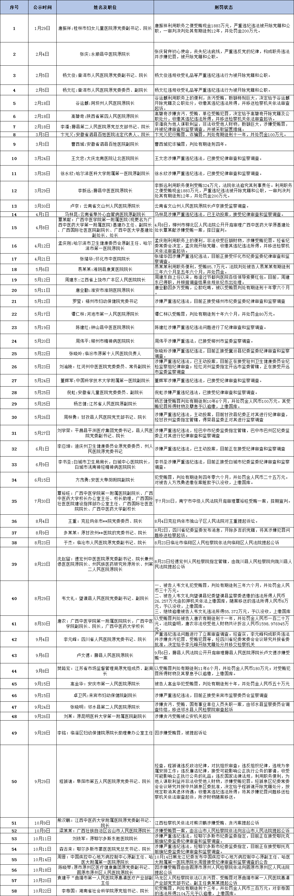 通过整理表格发现,这个58个院长违规违法行为中可见,共有16个院长因贪污受贿被判处刑罚,8个被开除党籍、公职,21个被审查、调查,11个因贪污受贿提起诉讼。