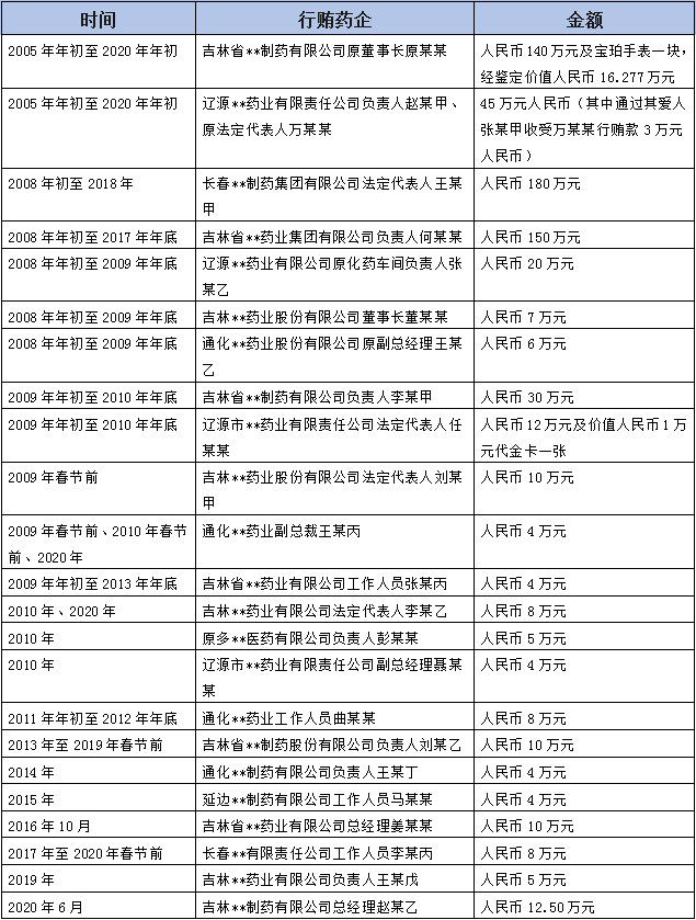 通过表格显示,被告人接受药企贿赂最长的时间跨度可达15年,接受的同一企业最高贿赂款为180万元,单笔受贿额度最高可达12.5万元。而且,在同一时期,被告人同时接受多家药企的贿赂,譬如2005年至2020年,收受贿赂人民币185万元及宝珀手表一块,经鉴定价值人民币16.277万元;2008年至2009年,收受贿赂33万元;2009年至2010年,收受贿赂42万元及价值1万元的代金卡一张。