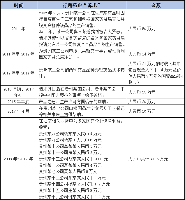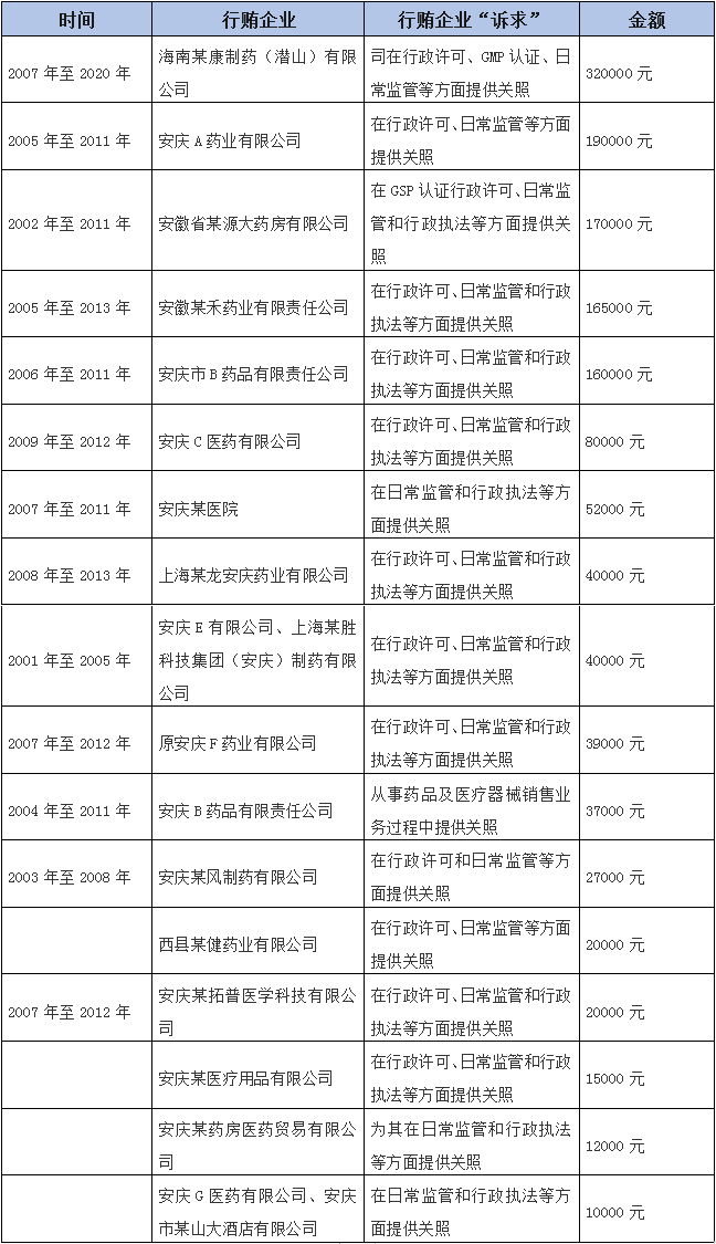 2001年至2020年,被告人王富智在分别担任安庆市医药管理局局长、安庆市药品监督管理局局长、安庆市食品药品监督管理局局长、安庆市人民防空办公室主任期间,利用职务上的便利,非法收受相关行政管理对象给予的现金1959000元及价值206000元消费卡,共计收受贿赂价值人民币2165000元,并为他人谋取利益。通过整理判决书列举的被告人受贿事实,截取部分和医药相关得行贿企业以及行贿“诉求”,如下表所示: