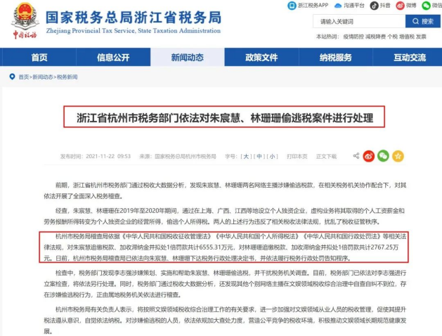 11月22日,杭州市税务局稽查局依据《中华人民共和国税收征收管理法》《中华人民共和国个人所得税法》《中华人民共和国行政处罚法》等相关法律法规,对朱宸慧追缴税款、加收滞纳金并拟处1倍罚款共计6555.31万元,对林珊珊追缴税款、加收滞纳金并拟处1倍罚款共计2767.25万元。