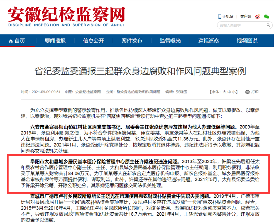 经调查,2013年至2020年,许梁在先后担任太和县农村合作医疗管理中心副主任、主任、太和县城乡居民基本医疗保险管理中心主任期间,利用职务便利,非法收受于某某等人财物共计84.06万元,为于某某等人在新农合定点医疗机构申报、新农合报补基金、城乡居民医保报补基金审核和拨付等方面提供便利、谋取利益。此外,许梁还存在其他违纪违法问题。2021年5月,太和县纪委监委给予许梁开除党籍、开除公职处分,其涉嫌犯罪问题移交司法机关处理。