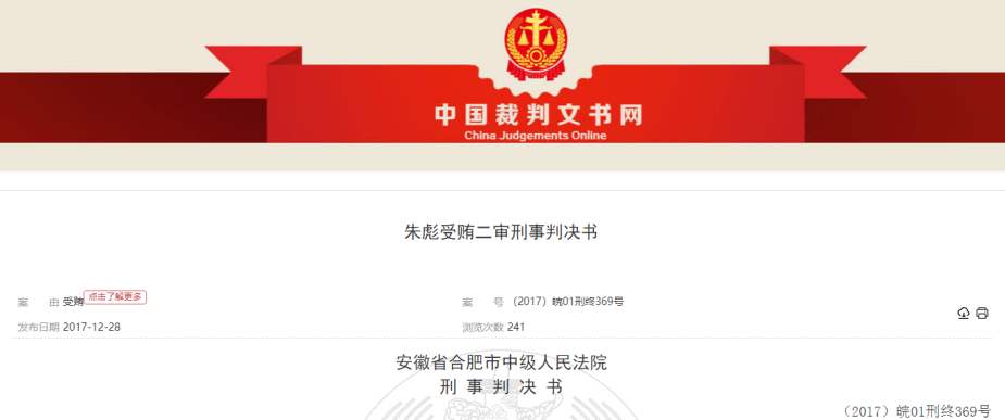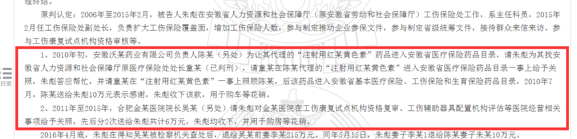在2017年中国裁判文书网发布的安徽省人力资源和社会保障厅(原安徽省劳动和社会保障厅)工伤保险处工作主任朱彪的判决书中,法院经审理查明的犯罪事实有一条显示:安徽沃某药业有限公司负责人陈某(另处)为让其代理的“注射用红某黄色素”药品进入安徽省医疗保险药品目录,请朱彪为其找安徽省人力资源和社会保障厅原医疗保险处处长童某(已判刑),请童某在陈某代理的“注射用红某黄色素”进入安徽省医疗保险药品目录一事上给予关照,朱彪答应帮忙,并请童某在“注射用红某黄色素”一事上照顾陈某,后该药品进入安徽省基本医疗保险、工伤保险和生育保险药品目录,2010年7月,陈某送给朱彪10万元表示感谢,朱彪收下该款,用于购车等花销。