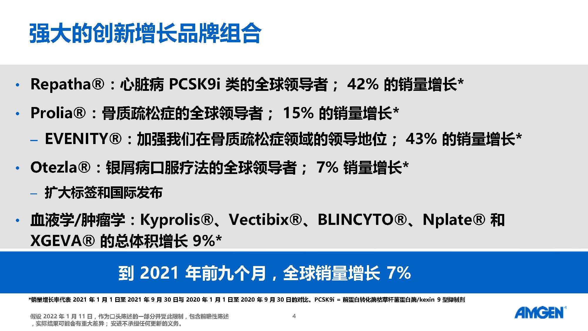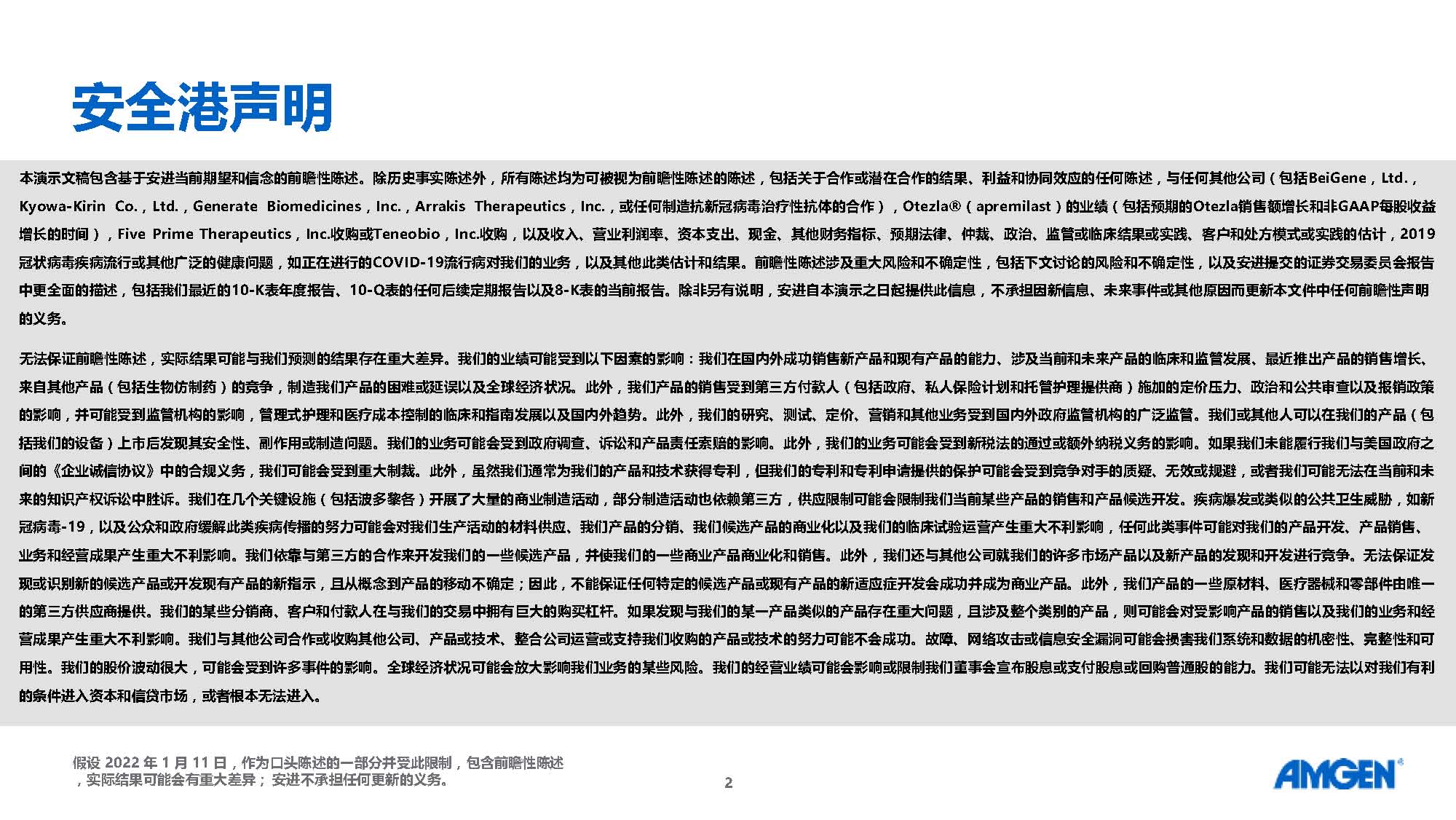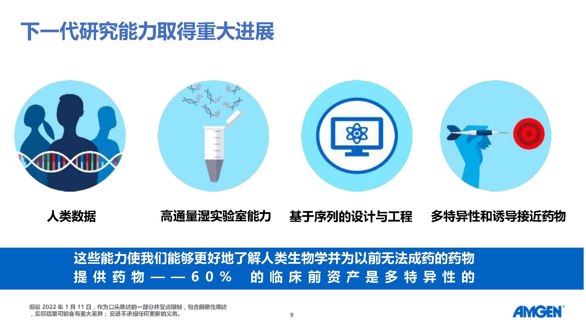 安进公司(Amgen)创立于1980年,主要从事人类创新药物的探索、研发、生产和销售,致力于释放生物学潜力,以造福患有严重疾病的患者。通过借助前沿人类遗传学等工具,安进公司力求揭示疾病的复杂性,洞察人类生物学的基本机制。