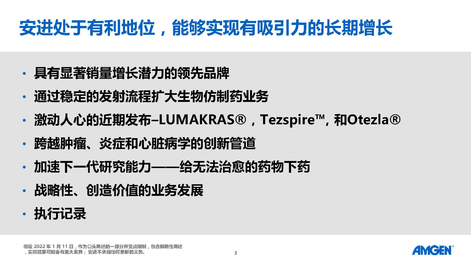 自2012年进入中国以来,安进以服务患者为使命,致力以科学与生物技术为本,造福中国患者并改善公共健康水平。安进中国总部设于上海,业务覆盖全国近80个城市。在中国,安进聚焦心血管疾病、骨健康、炎症、肾病等亟待满足的慢性疾病领域,为患者提供创新治疗选择。