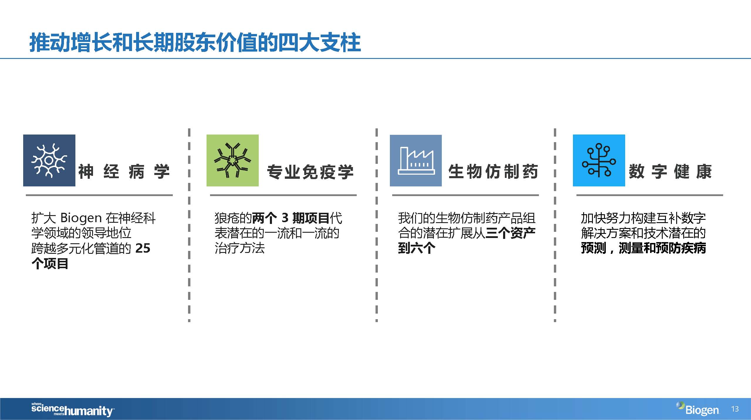 渤健在进入这两个市场的时候,也会有稳定的财务支持,而推动增长和长期股东价值的四大支柱: