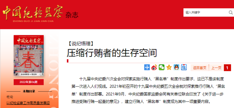 近期,中国纪检监察杂志发布了一篇关于行贿受贿的文章——《压缩行贿者的生存空间》,文章内容显示探索实施行贿人“黑名单”制度,是进一步推进受贿行贿一起查、巩固发展反腐败斗争压倒性胜利的应有之义。当前,腐蚀和反腐蚀斗争依然严峻复杂,行贿人不择手段“围猎”党员干部是腐败增量仍有发生的重要原因。