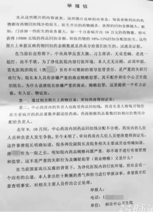 举报者称,自己是绥宁县人民医院的医师,举报医院吃回扣的原因是净化行医环境。在其举报信中,箭头首先直指绥宁县人民医院院长:医院的院长负有不可推卸的领导监管责任,是严重的失职行政行为,院长本人具有涉嫌严重的商业贿赂犯罪,其不配作绥宁县人民医院院长。除此之外,举报信中显示,大药商承包了医院药房,医院98%的药品属于两位大老板。其中,大药商给的回扣是:抗生素10%-15%/支,泮托拉唑针剂、奥美拉唑针剂10元/支;丹红注射液25元/支;氨溴索、异丙托溴铵2-3元/支。