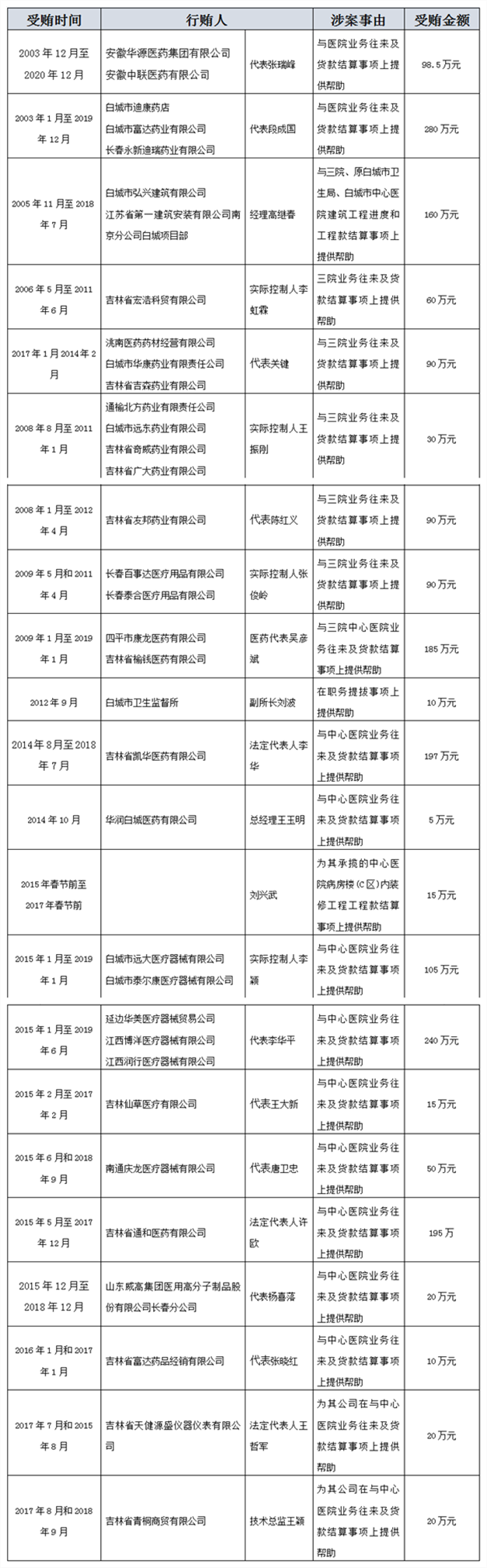 起诉书显示,2003年至2020年12月,被告人李某某利用其先后担任********院长(以下简称**),原白城市卫生局局长、白城市中心医院院长的职务上便利,为他人牟取利益,非法收受22人钱款,共计人民币1985.5万元。
