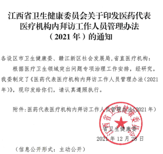 而且,今年1月10日,江西省卫生健康委员会也发布了首部医药代表医疗机构内拜访工作人员的管理办法——《关于印发医药代表医疗机构内拜访工作人员管理办法(2021年)的通知》。