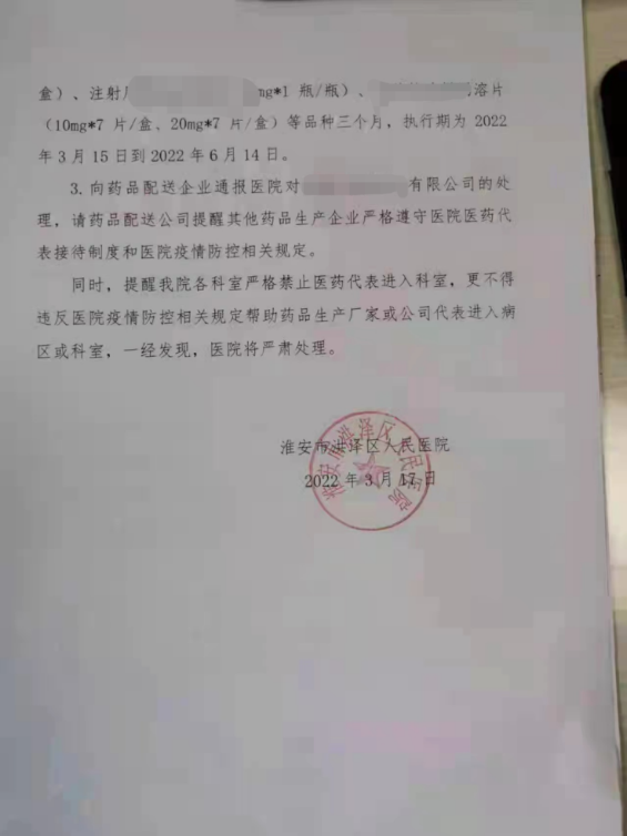 4.2021年8月,江西省肿瘤医院医务科、药剂科、纪检监察室三大部门联手,在医院门诊大楼12楼的廉政会议室对这家外企的负责人、配送公司的负责人进行了约谈,要求立即做出整改。