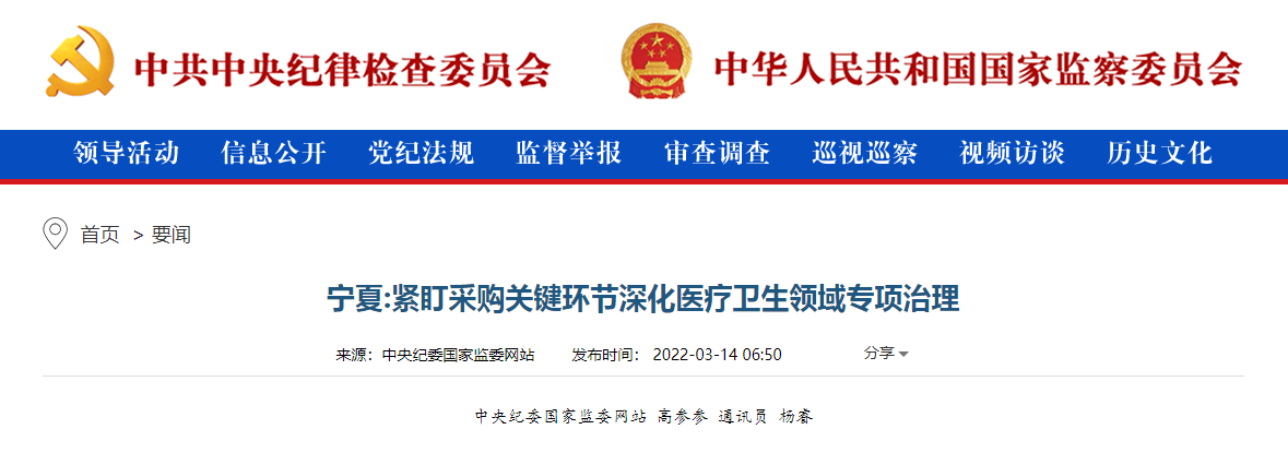 近期,中纪委在其平台上发布了一则宁夏回族自治区纪委十二届六次全会提出的要“紧盯采购关键环节深化医疗卫生领域专项治理”的文章。纪委监委有关负责人表示,今年将延伸工程建设政府采购重点领域监督触角,重点针对近年来社会关注度高、影响大的医疗卫生领域深入开展专项整治。