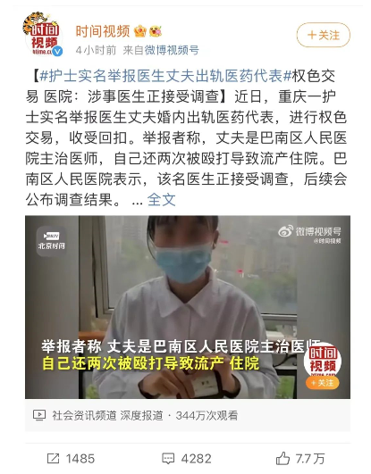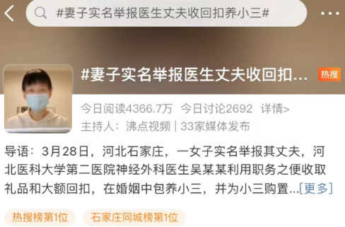 除了上述的举报医生丈夫的新闻,在3月28日当天,河北石家庄一女子通过发布视频的方式也对其医生丈夫进行了实名举报,举报内容仍然包括收受回扣。