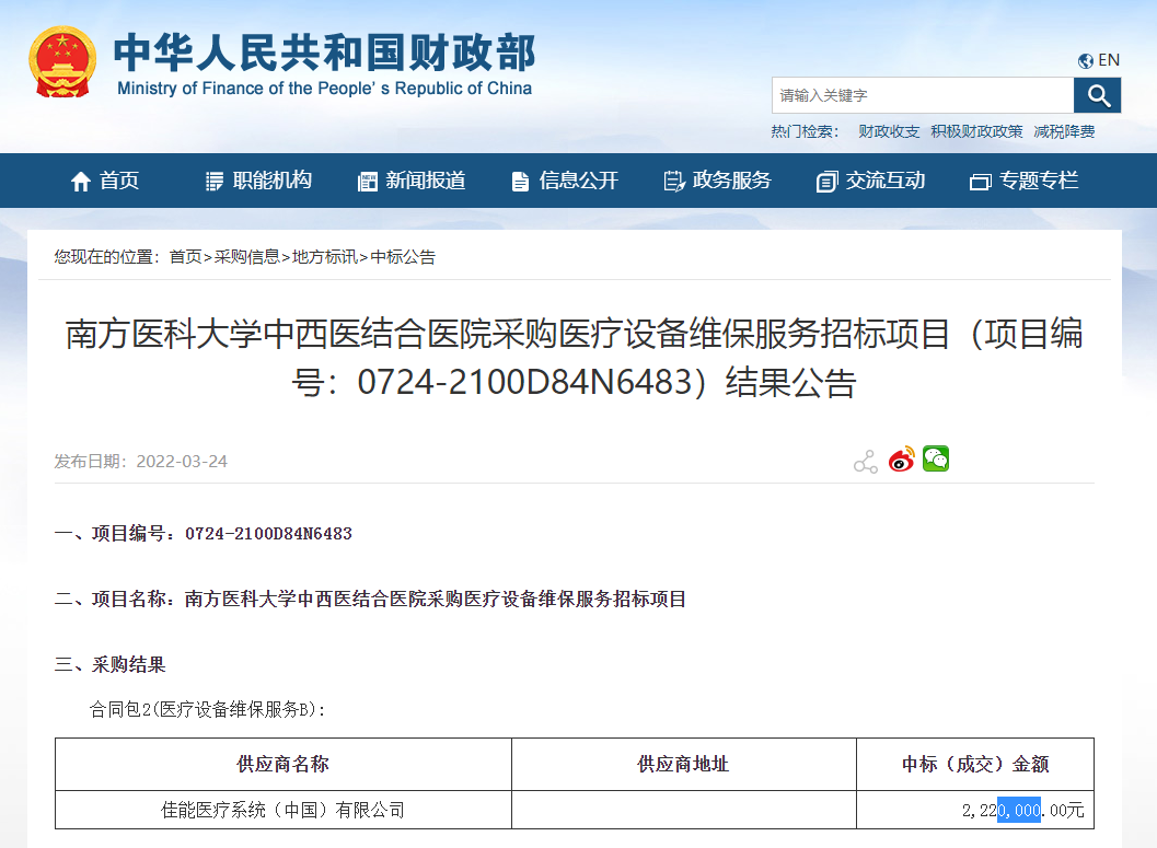近日,南方医科大学中西医结合医院采购医疗设备维保服务招标项目对外进行结果公告,中标的医械企业是佳能医疗系统(中国有限公司),中标金额222万元。