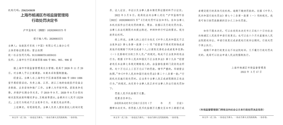 上海市市场监管局网站显示,因贿赂利用职权或者影响力影响交易的单位或者个人,佳能医疗系统(中国)有限公司上海分公司被上海市杨浦区市场监管局罚款98万。