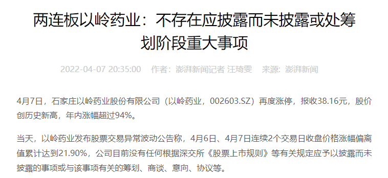 “4月7日,石家庄以岭药业再度涨停,报收38.16元,股价创历史新高,年内涨幅超过94%。当天,以岭药业发布股票交易异常波动公告称,4月6日、4月7日连续2个交易日收盘价格涨幅偏离值累计达到21.90%。”