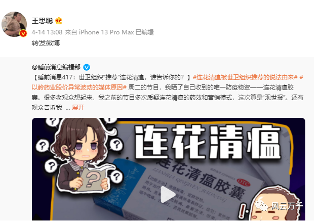 对于王思聪转发评论的微博以岭药业的工作人员回应表示:关于微博上所传的消息,请指出具体的问题与源头,我们将对具体内容做解答。从临床试验,到具体的实验数据,再到被收入到新冠肺炎诊疗方案,包括适应症与说明书,我们都有完整的证据和报告披露。不能因为‘王思聪’三个字眼,就随意提出疑问,对于网络上的一些言论,听听就罢了,投资者请加以甄别。