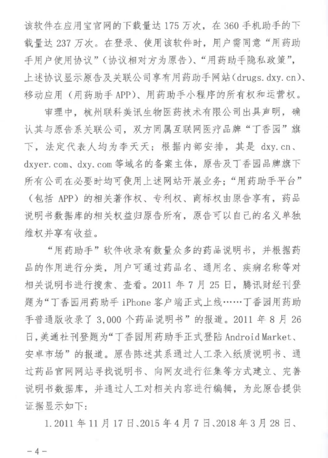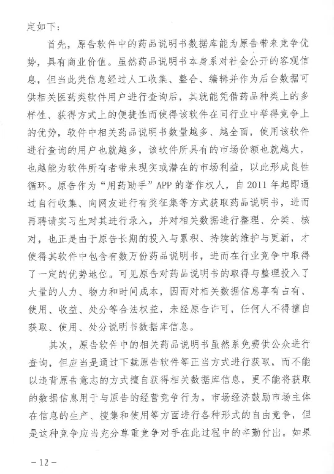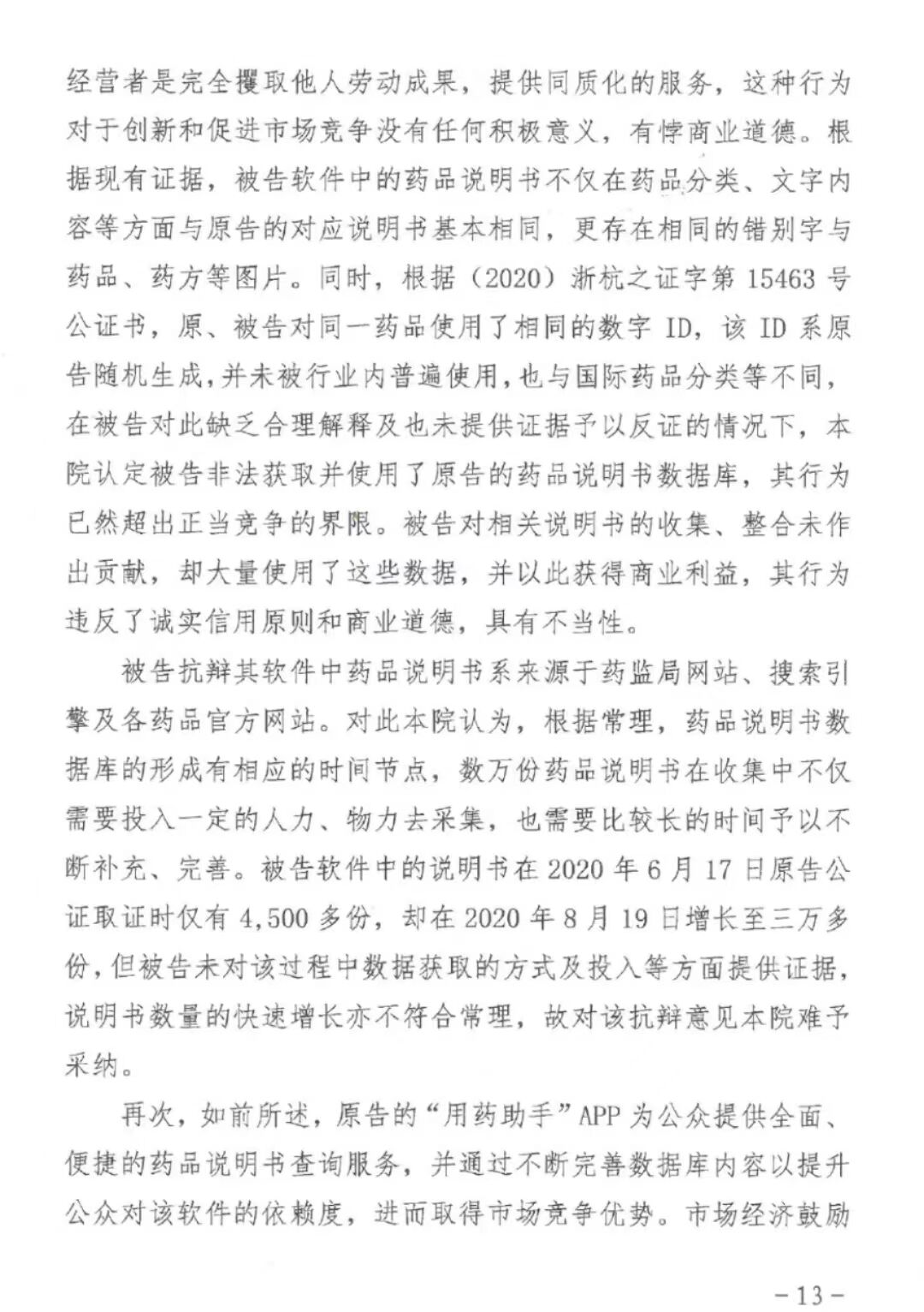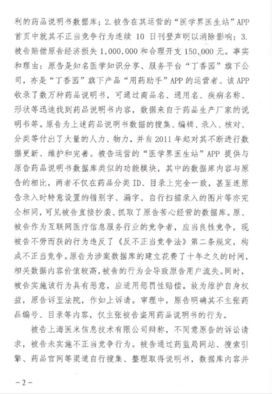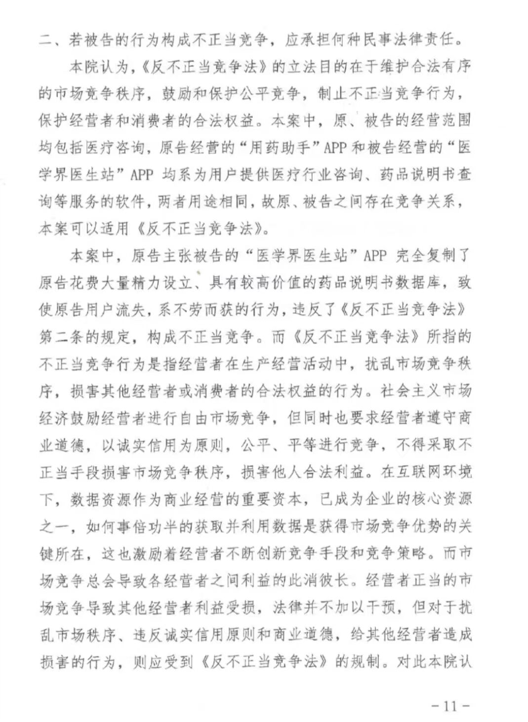 同为互联网医疗行业的两家公司,丁香园和医学界在行业内都有着不错的口碑,而丁香园“用药助手”花费多年时间持续制作累积沉淀的药品说明书数据库,医学界却直接将整个数据库内容搬运至医学界APP,这种不劳而获的行为,明显构成侵权,本次“丁香园”诉“医学界”爬取其药品说明书数据库,经法院认定构成不正当竞争。