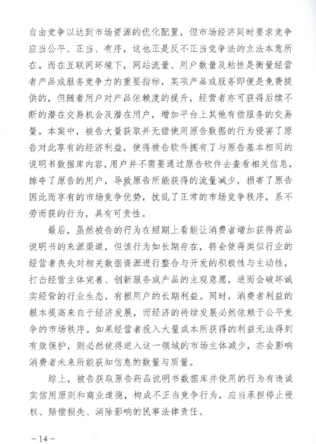 2. 虽然被告的行为在短期上看能让消费者增加获得药品说明书的来源渠道,但该行为如长期存在,将会使得类似行业的经营者丧失对相关数据资源进行整合与开发的积极性与主动性,打击经营主体完善、创新服务或产品的主观意愿,进而会破坏诚实经营的行业生态,有损用户的长期利益。