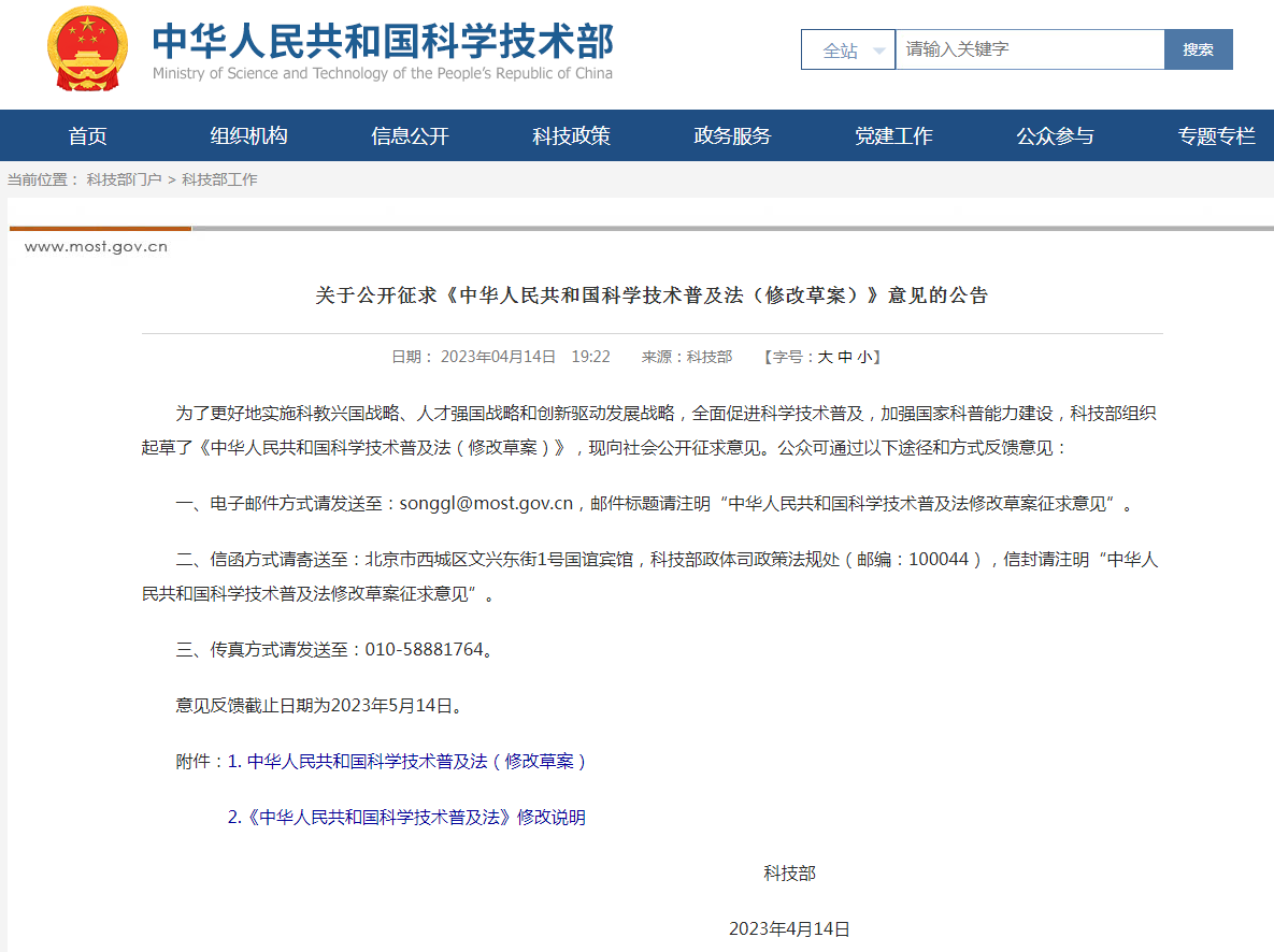 近日,科技部发布《关于公开征求<中华人民共和国科学技术普及法(修改草案)>意见的公告》(以下简称:《修改草案》)。