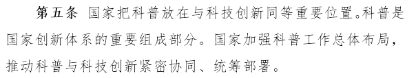 《修改草案》第五条强调了:国家把科普放在与科技创新同等重要位置。