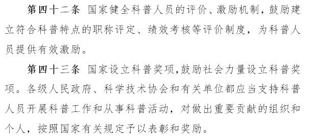 第四十二条提到:国家健全科普人员的评价、激励机制,鼓励建立符合科普特点的职称评定、绩效考核等评价制度,为科普人员提供有效激励。